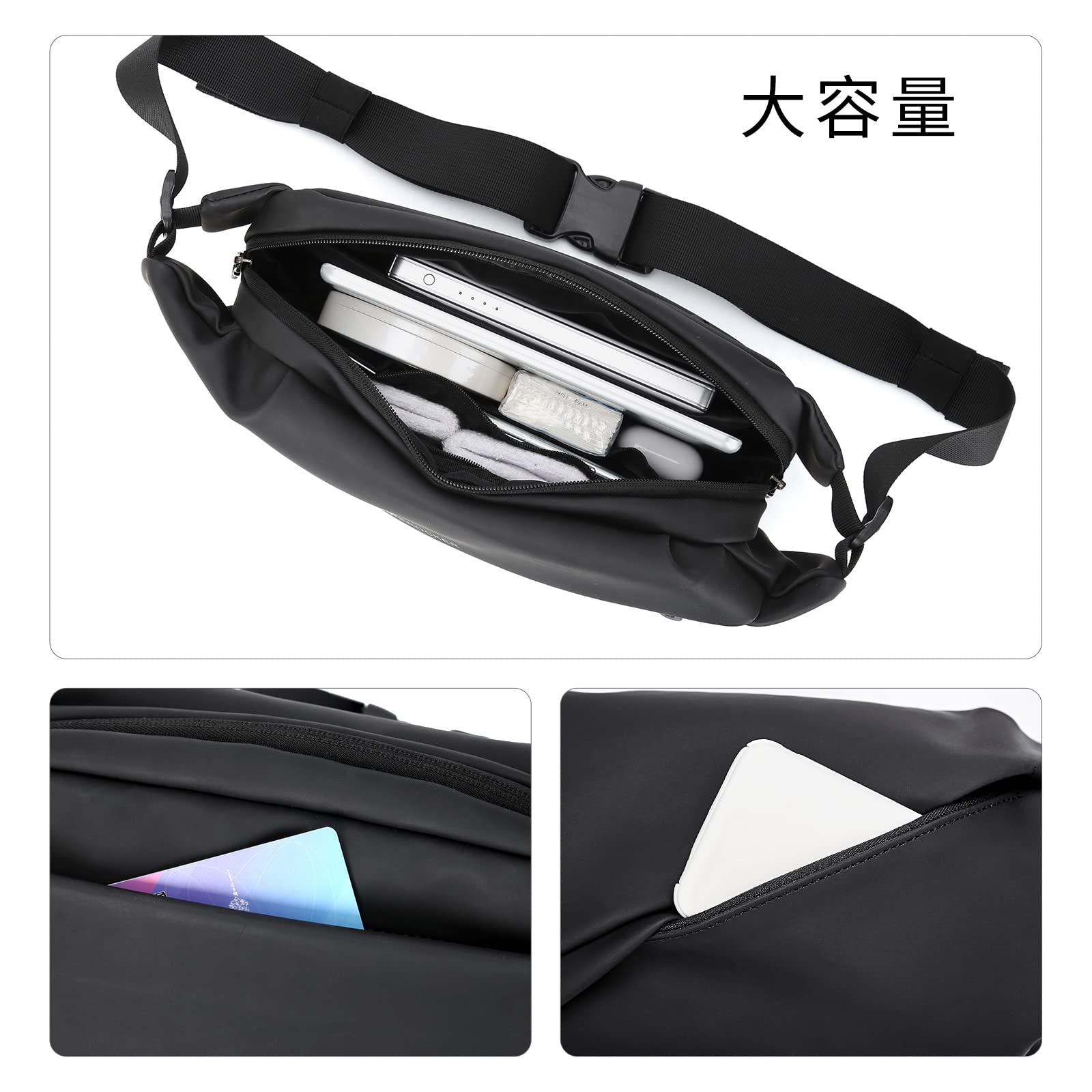 [複数のポケット、整頓]:ニーズに合わせて3つの別々のジッパー式ポケットでしっかりと構築されています。メインのジッパーコンパートメントには、標準のウォーターボトル(550ml)、電話、サングラス、現金、鍵を簡単に収納できます。内側のスロットとジッパーポケットは、カードやコインなどの小物に使用できます。フロントのジッパーポケットは小物を収納するのに便利です。背面の盗難防止ポケットは貴重品として使用でき、感覚を与えます。セキュリティの。