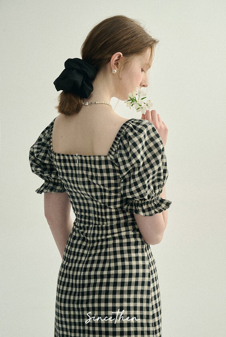 SinceThenキュート スリム チェック バブ ワンピース ショート 綿100% 2024 夏